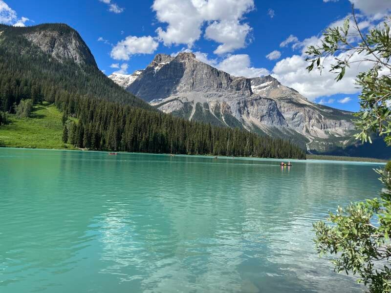 Vanuit Glaciers NP ging het direct over naar Yoho NP. Hier hebben de Natural bridge gezien. Dit is een plek waar de rivier een gat in de rotsen heeft gemaakt en met alle geweld doorheen stort. Na de Natural bridge 5 km verderop kwamen wij bij Emerald lake. Hier begint het voor het eerst echt goed toeristisch te worden. Maar het meer was op een mooie plek neergelegd met een groene kleur.