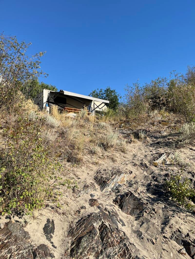 Na een hete avond en een nachtje airco heerlijk wakker geworden met uitzicht op de rivier. En onverwacht kwam er een bald eagle voorbij. Je kent hem als kenmerkend witkop Arend vanuit de USA.