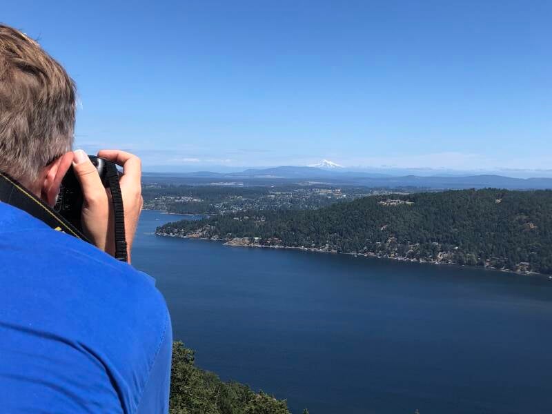Daarna door naar Malahat Skywalk, stond op Daan z'n lijstje. Hoge uitkijktoren met glijbaan naar benden. Prachtig uitzicht over Vancouver Island en zicht op vulkaan Mount Baker 3238M. Staat al paar jaar in verwachting tot uitbarsten.