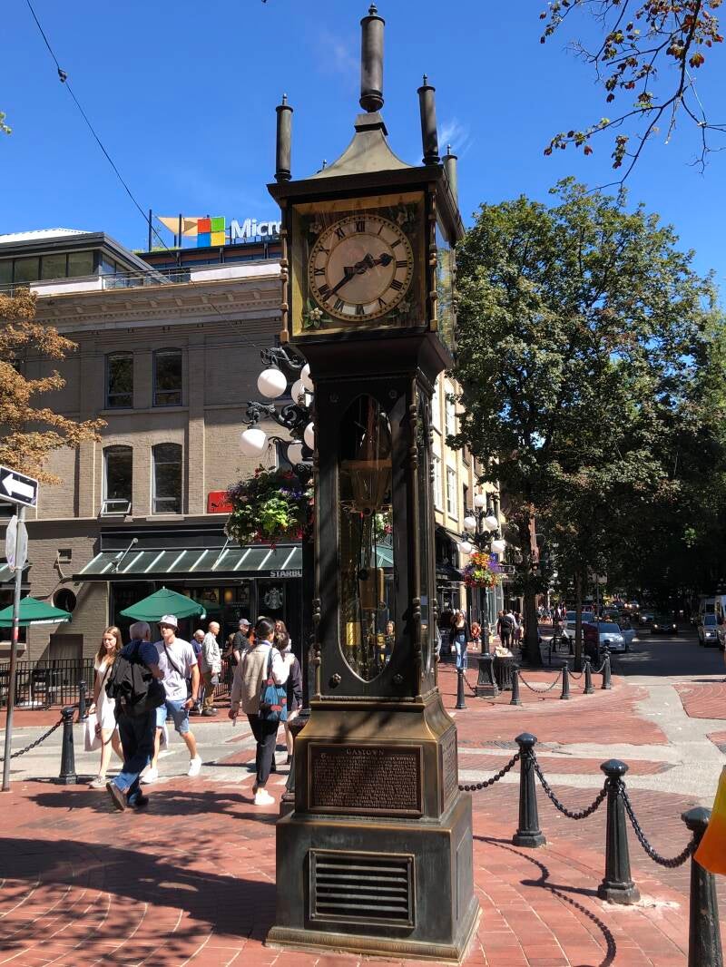 Vanaf het hotel met de shuttlebus naar AirPort daar eerst de maagjes gevuld en dan met de Skytrain het centrum in, eerste stop de steamclock dan naar Vancouver lookout voor fascinerend uitzicht over de stad.